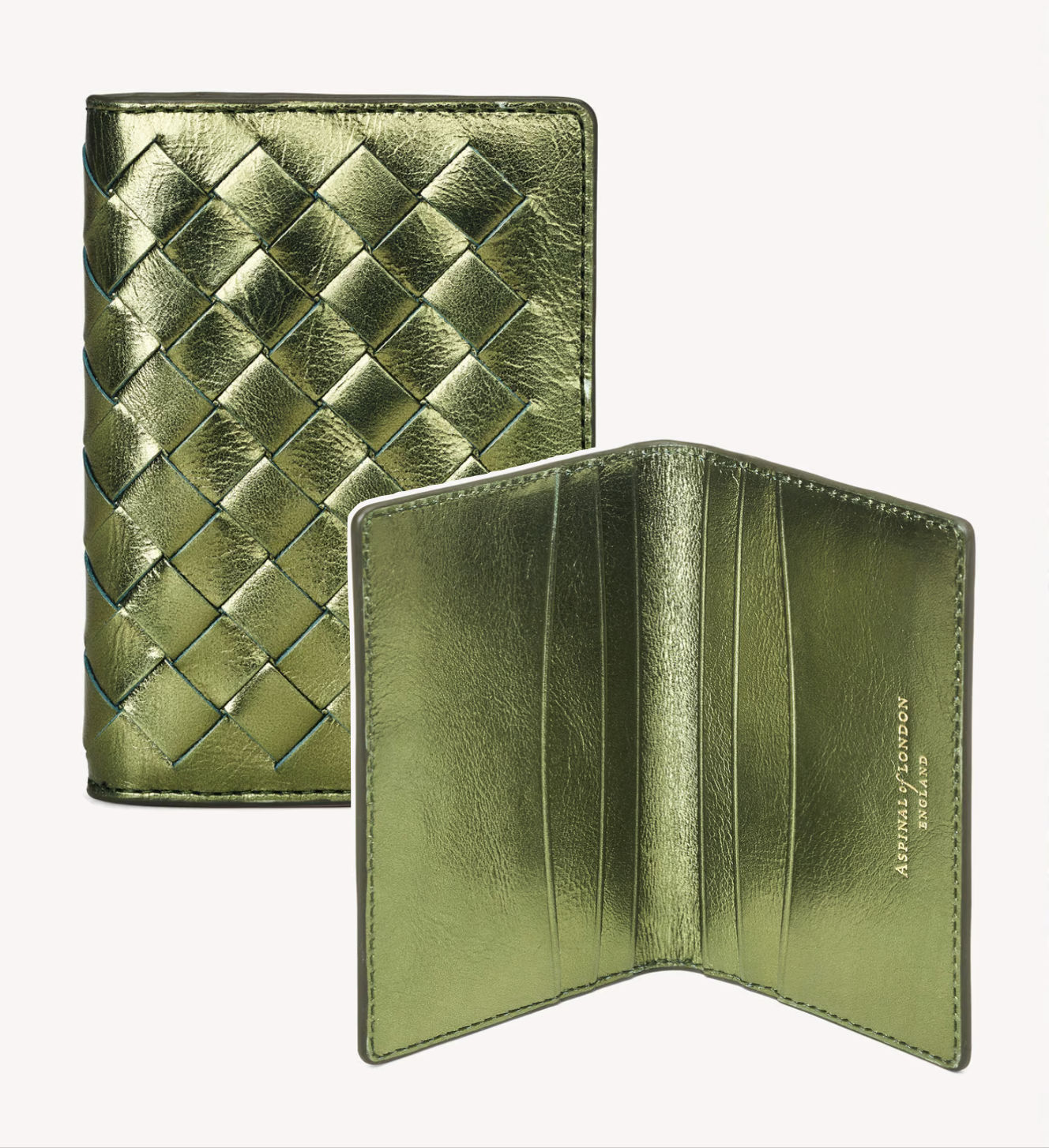 Aspinal of London Double Fold Credit Card Holder in Verdant Green Metallic Woven Leather