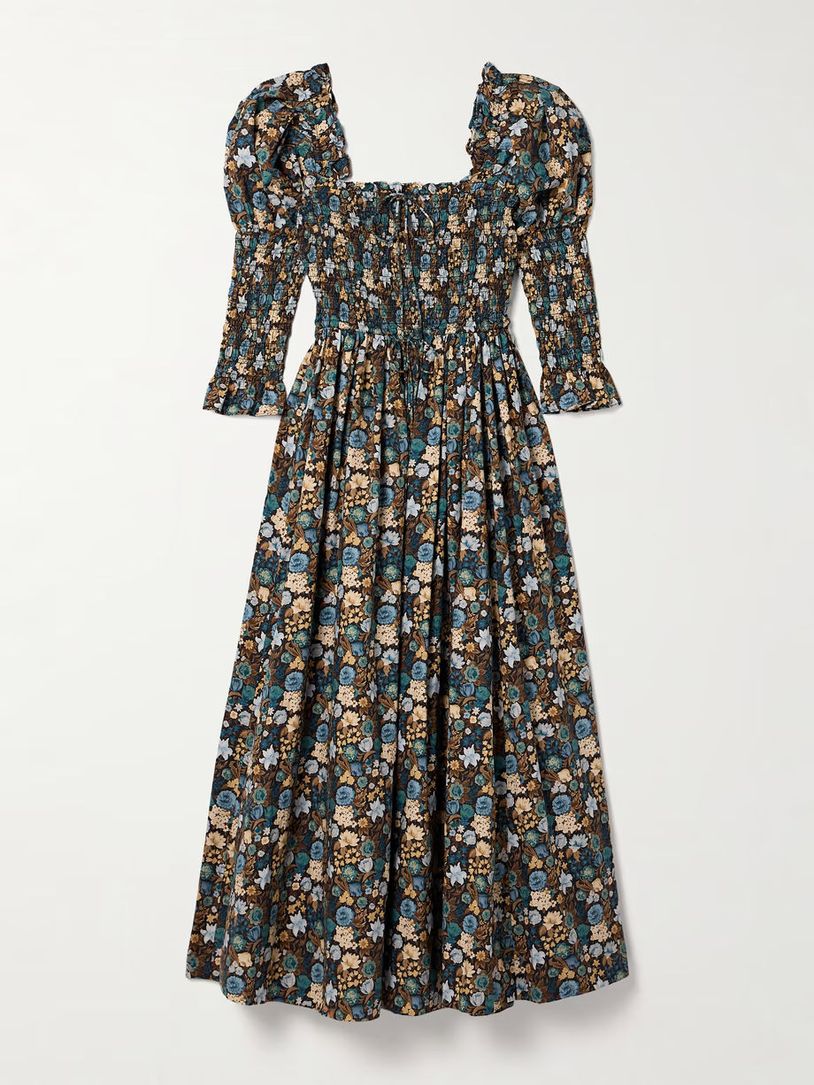 DÔEN Bijou shirred floral-print organic cotton-voile midi dress