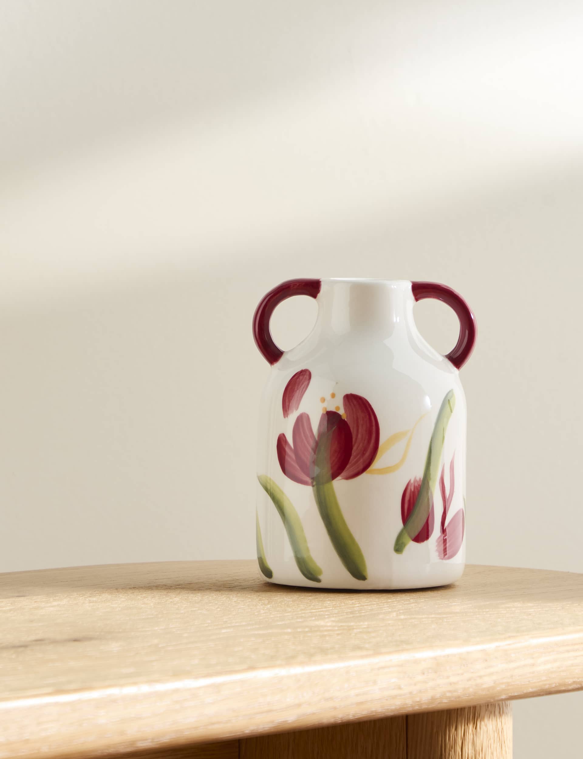 An artistic painted floral design gives this vase a pretty, rustic look. The small curved piece is crafted from durable ceramic and features two handles picked out in a co-ordinating colour.