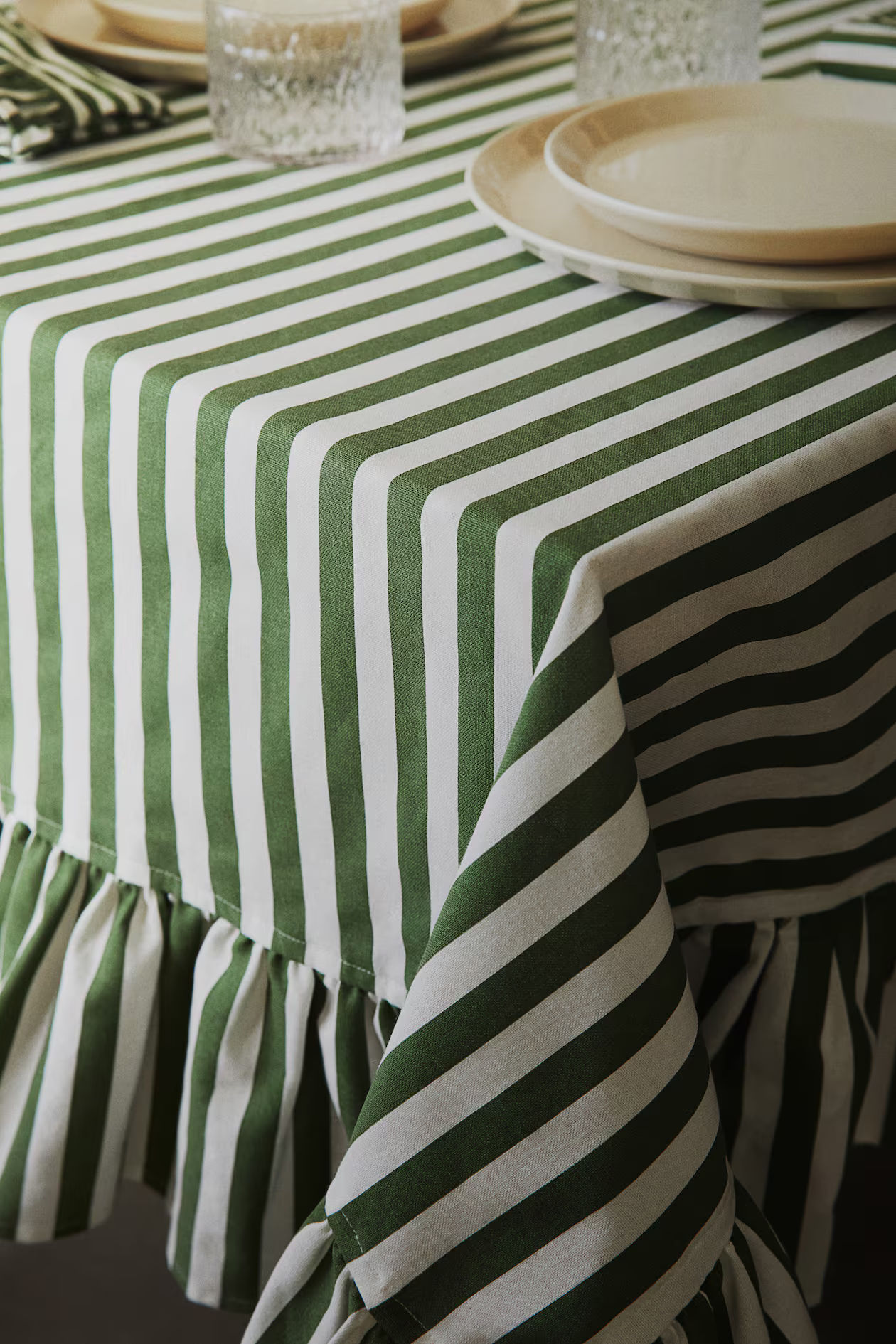 Tablecloths instantly elevate your home and can really set the scene if you're tablescaping. H&M have an array of dreamy tablecloths, and this frill-trimmed green striped number is just one of many.