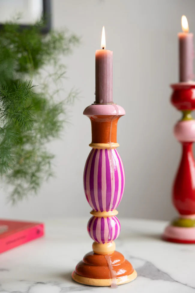 Adding some zest and bold colour into your home has never been easier thanks to this ornate candlestick holder. With block colours and stripes, this fun accent is a surefire way to add flair to your coffee table or dining table.