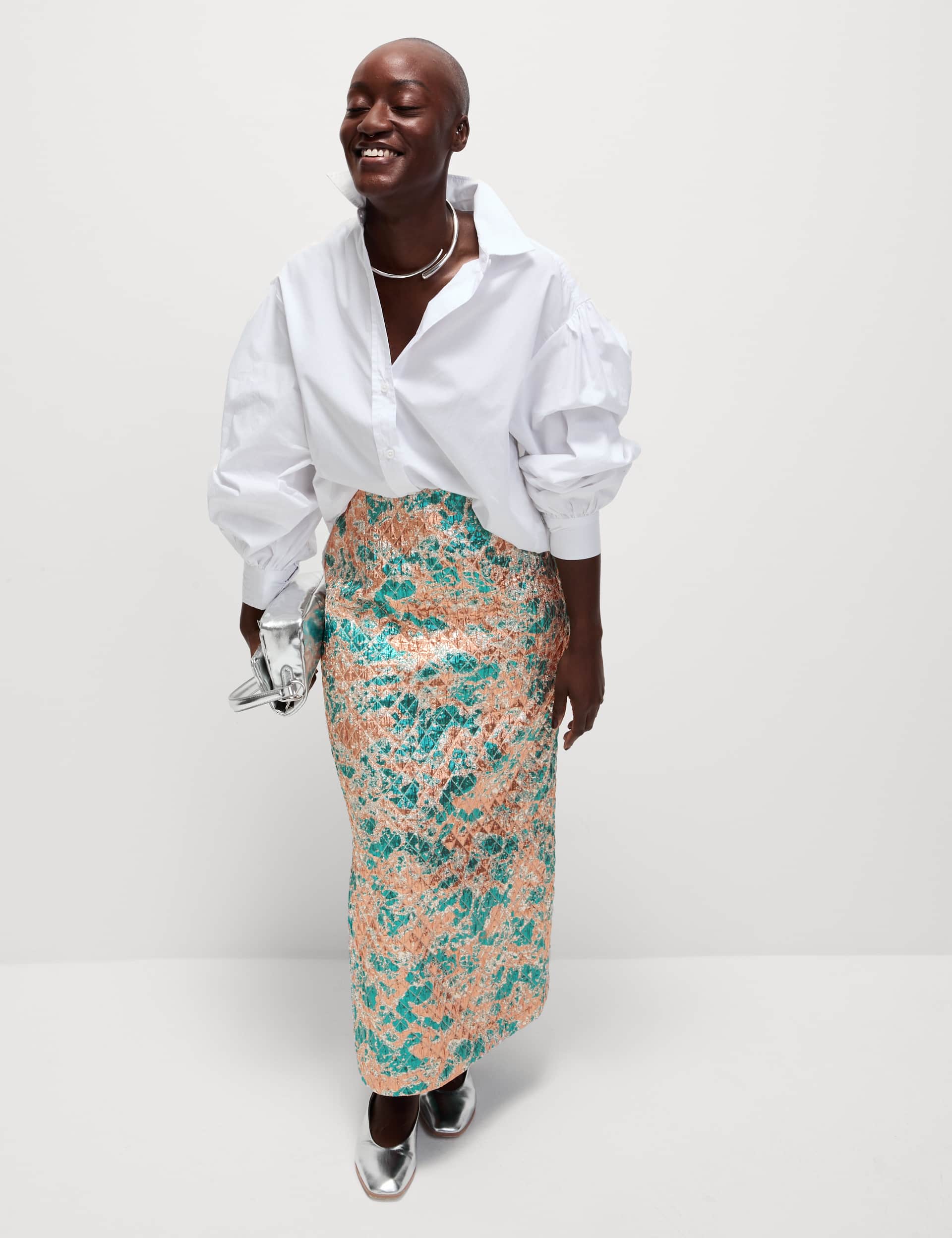 This striking midaxi-length skirt is perfect for the festive season - it's quilited with metallic jacquard fabric that shines like tinsel.