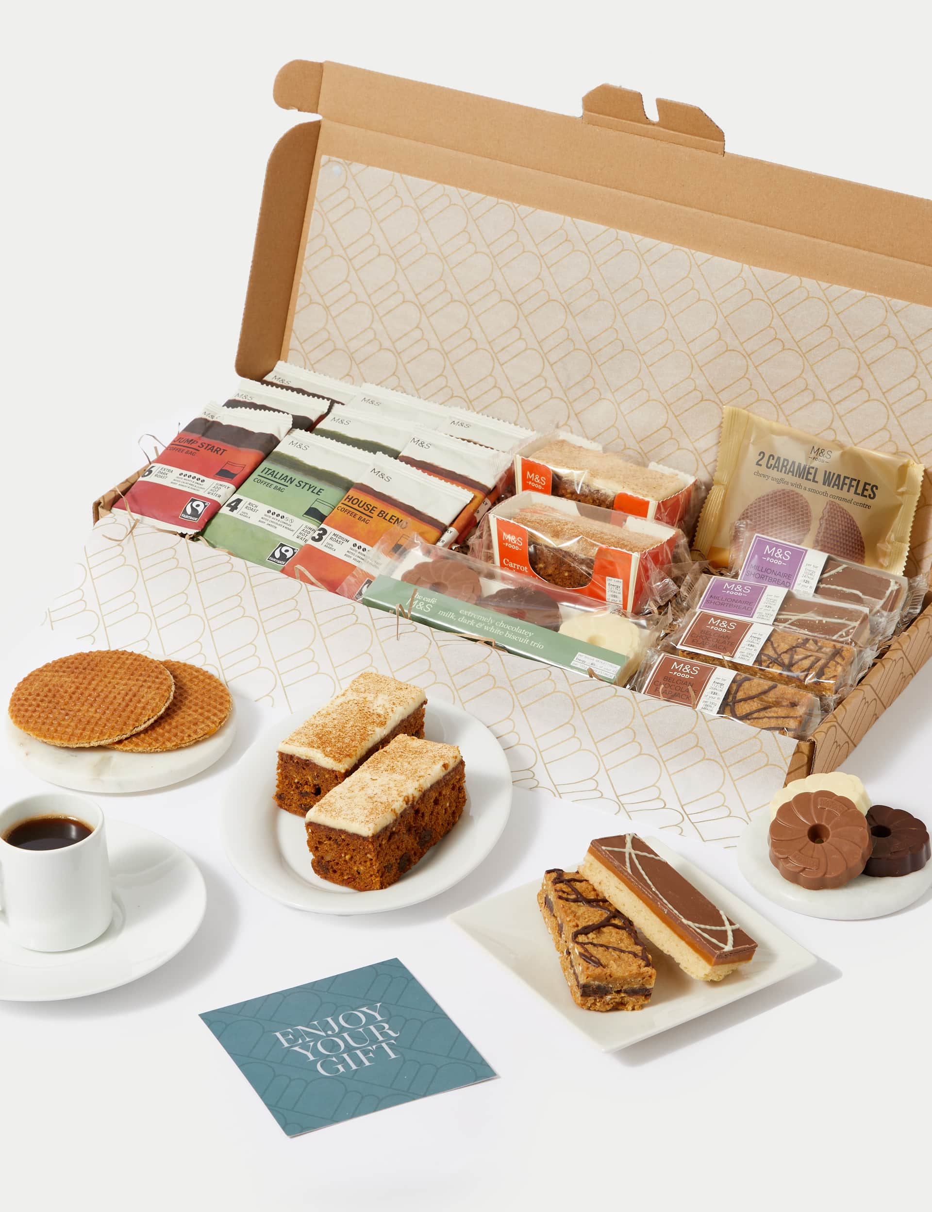 Make someone's day by sending them this Coffee Morning Letterbox gift. Inside, they'll find three varieties of coffee plus some perfectly-paired treats including carrot cake, indulgent millionaires shortbread, and M&S's famous chocolate coated custard creams.