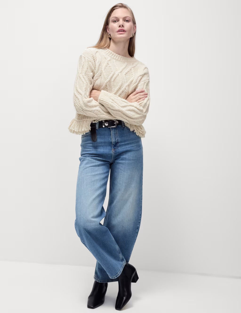 Crew Neck Cable Knit Fringe Jumper