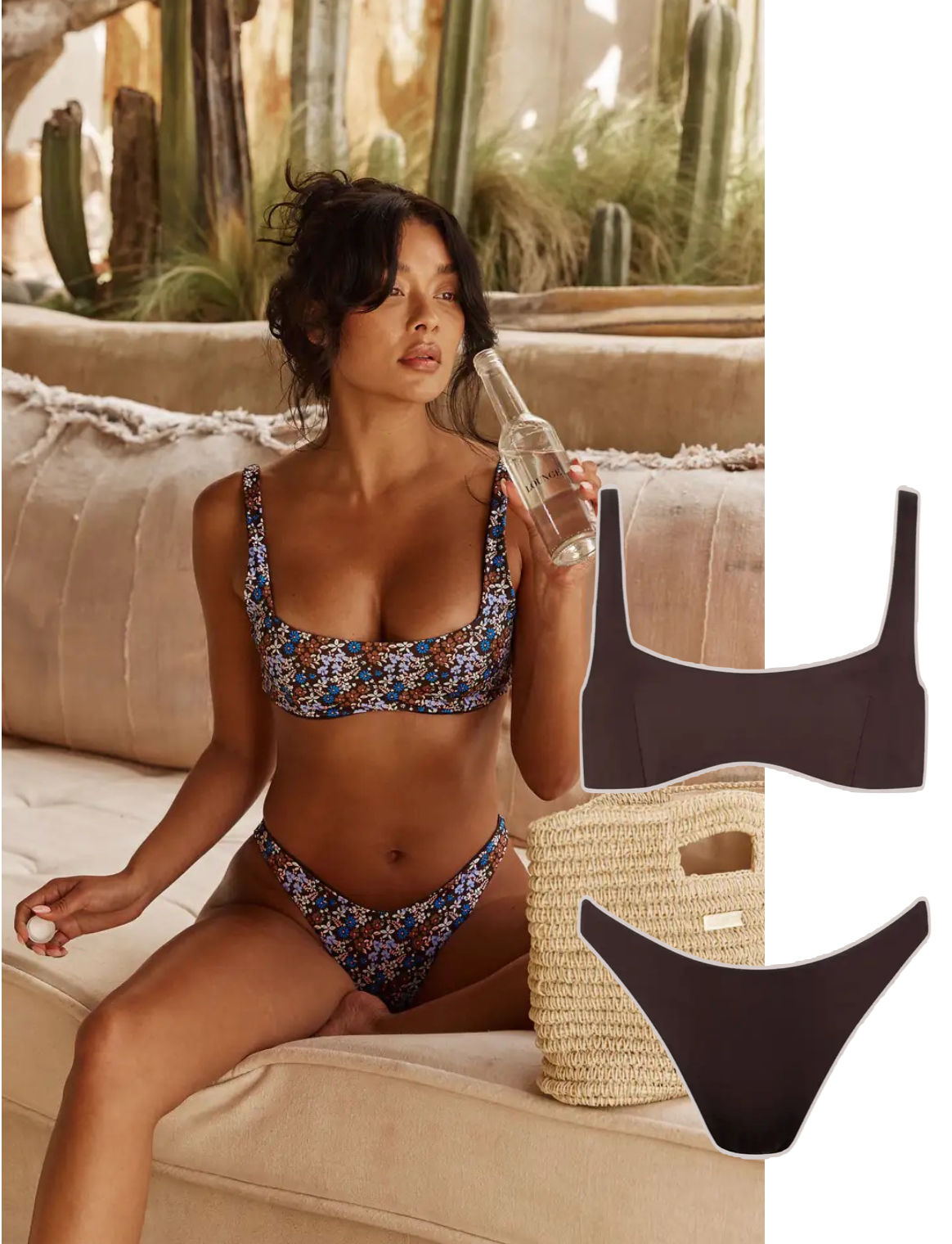 If you prefer a sportier silhouette, you'll love the plunge crop top. It still feels supportive but without the need for an underwire, and looks great with the matching minimalist thong (perfect for tanning!). I'm particularly fond of the reversible brown - very chic 90s.