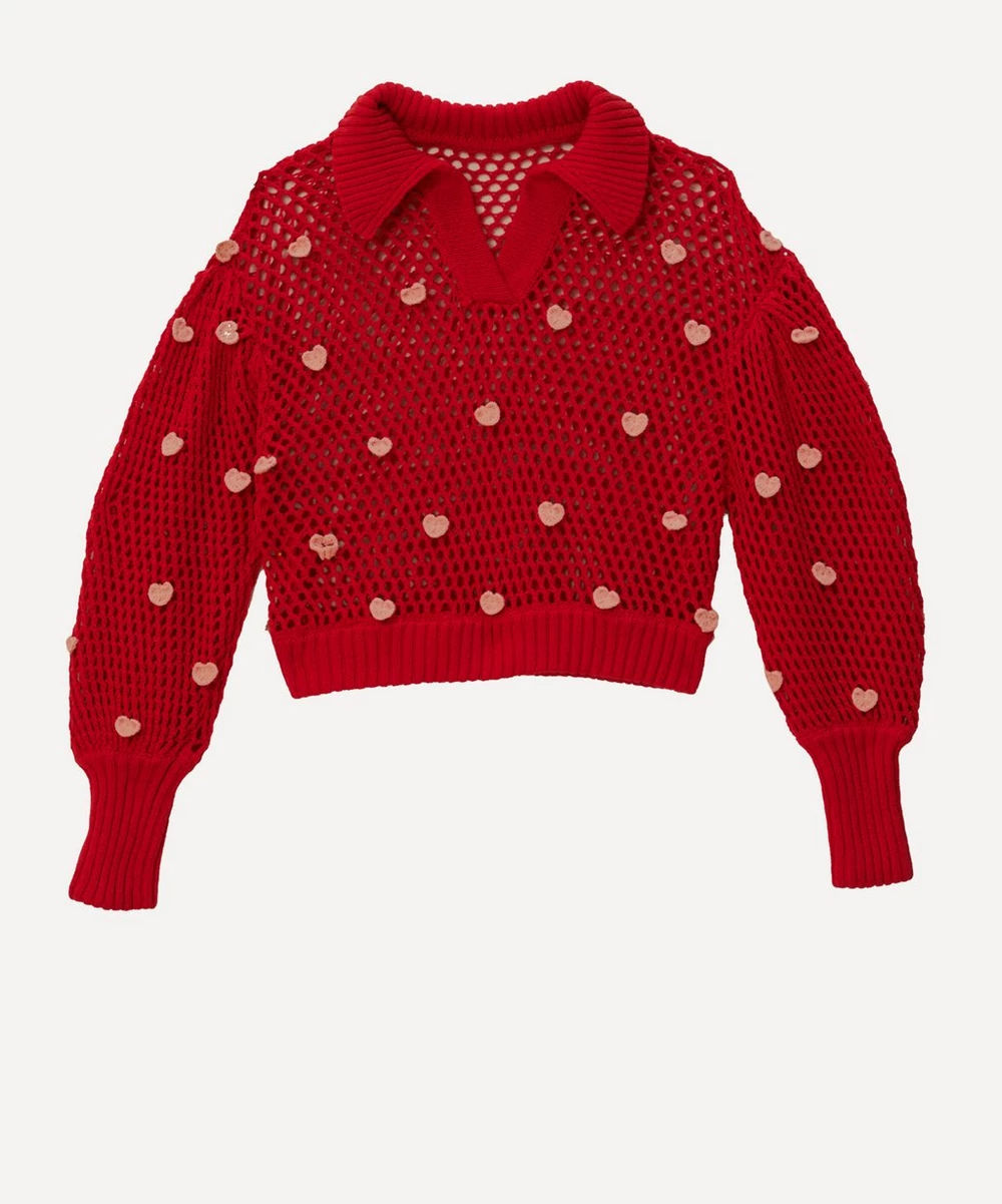 Featuring vibrant, handcrafted heart details, this sweet and chic knit is a playful yet stylish way to wear your heart on your sleeve—literally. Just add denim.