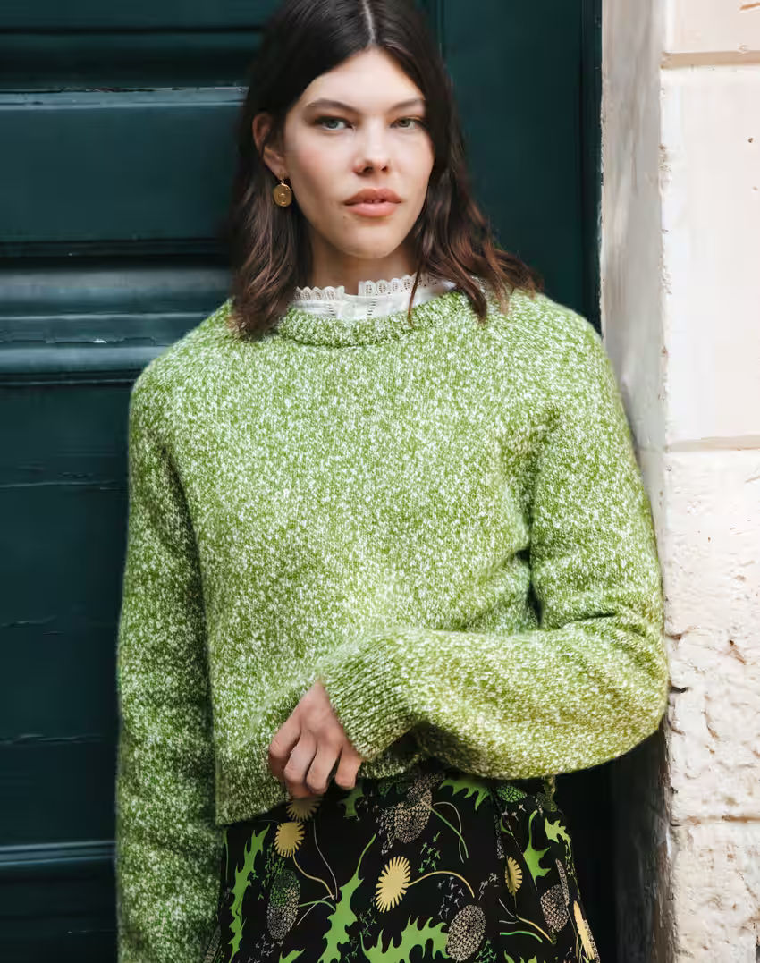 Another joyful spring-appropriate cardigan, this time knitted using Brora's famous, flecked, Italian-spun Donegal yarn. Perfect worn alone buttoned right up to the charming ribbed collar, or layered open over a white vest.