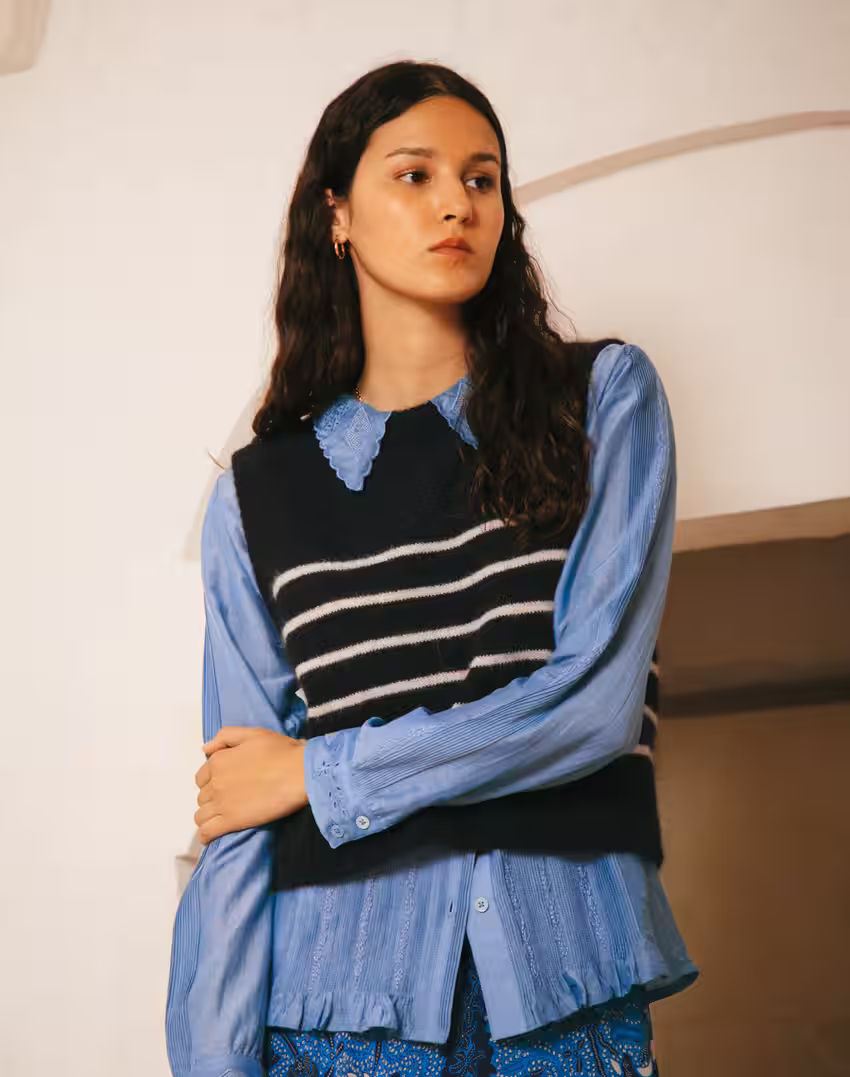 Replicating this look immediately. Putting a cool-girl spin on the classic breton stripe knit, this vest looks so smart layered over a shirt. Feeling hot under the collar? Wear bare underneath, paired with ecru barrel jeans.