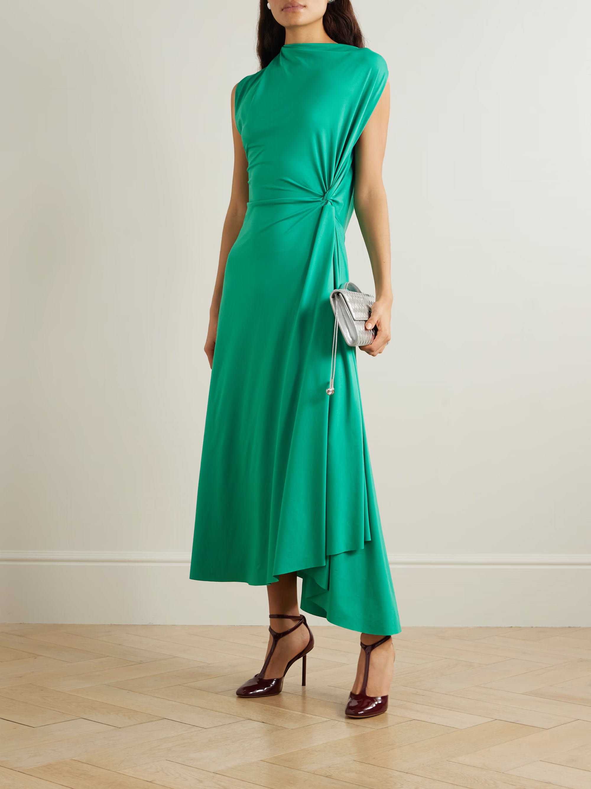 The draped panel and gathered side elevates the simple shape of Victoria Beckham’s midi dress to something much more impactful.