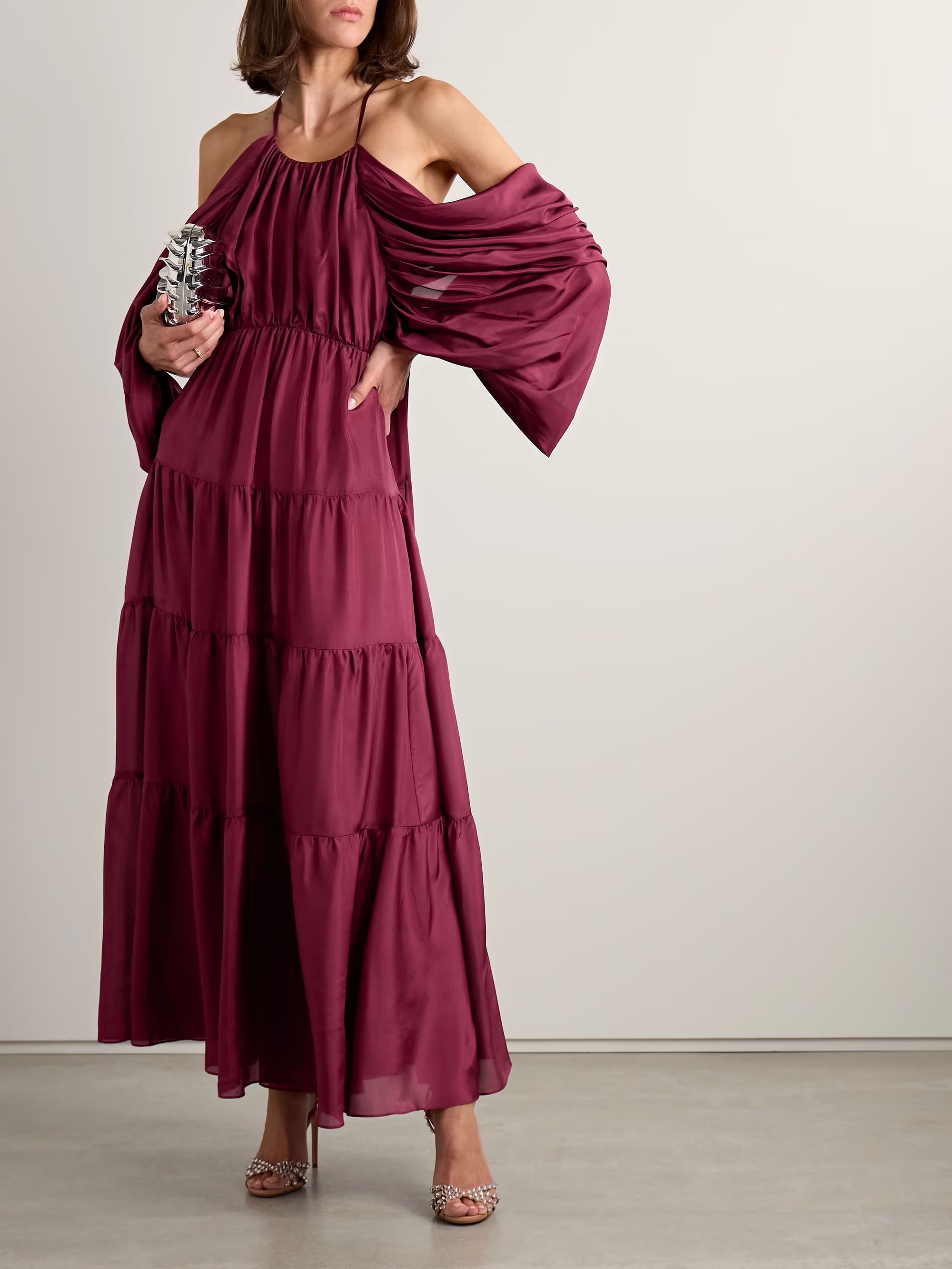 Tiers of silk-satin in a rich burgundy and high-volume draped sleeves deliver serious drama. A perfect fit for a winter wedding with gold accessories.